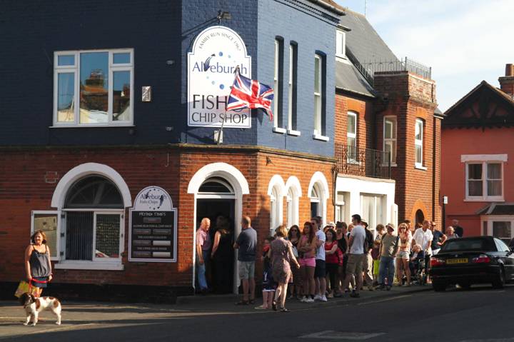Das Queuing vor den (offenbar berühmten) Fish&Chips Shops währt Tag und Nacht, wir haben nie keine Schlange gesehen. In den Restaurants gibt es diese Speise immer, aber in sehr unterschiedlicher Qualität. |